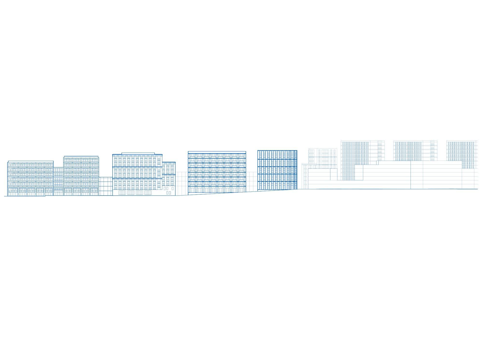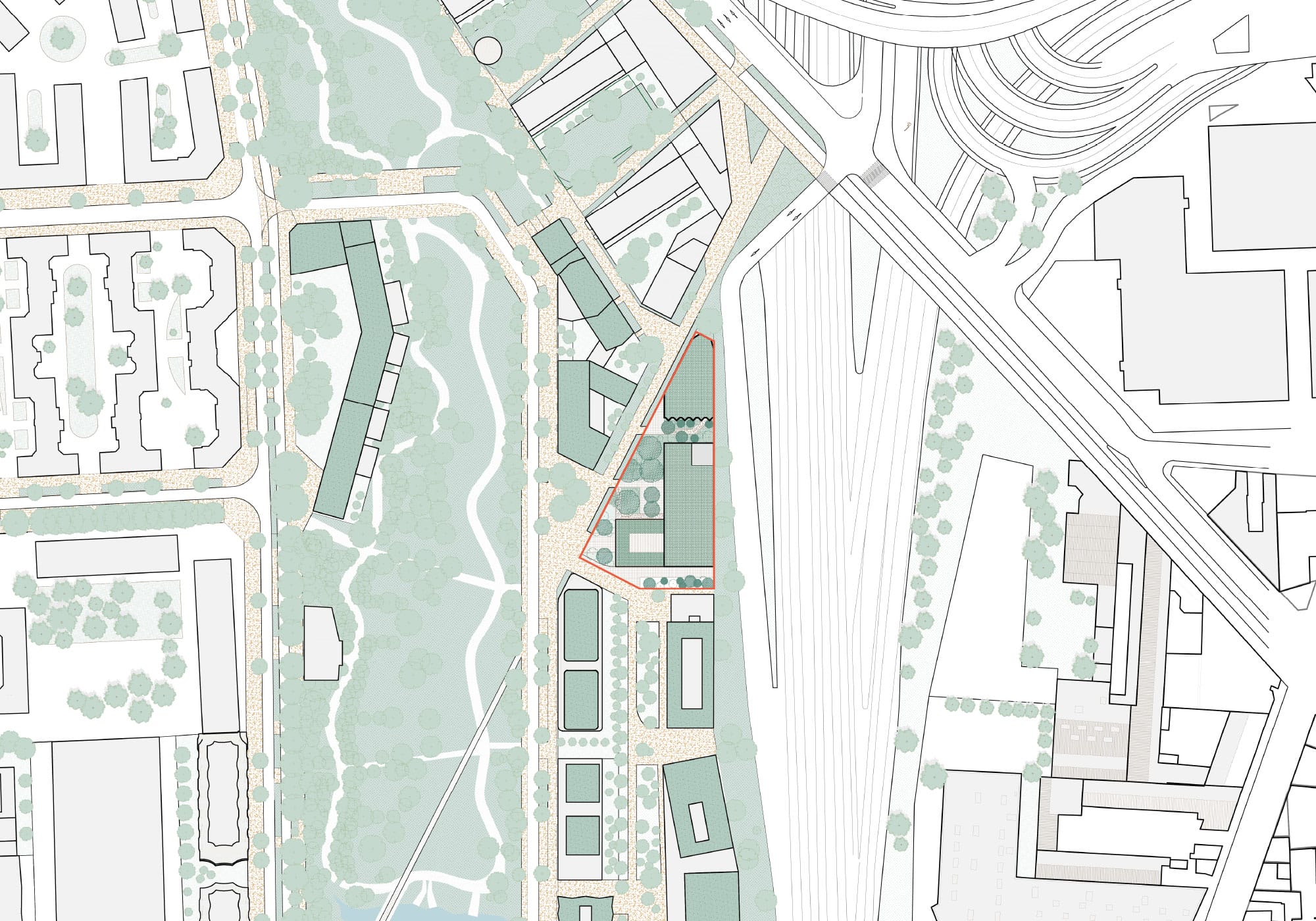 L’hôtel s’implante sur la proue nord du lot 5, à l’articulation entre le périphérique et le nouveau quartier. Ce bâtiment compact s’élève en R+9, marquant ainsi une entrée forte et singulière depuis le boulevard périphérique.