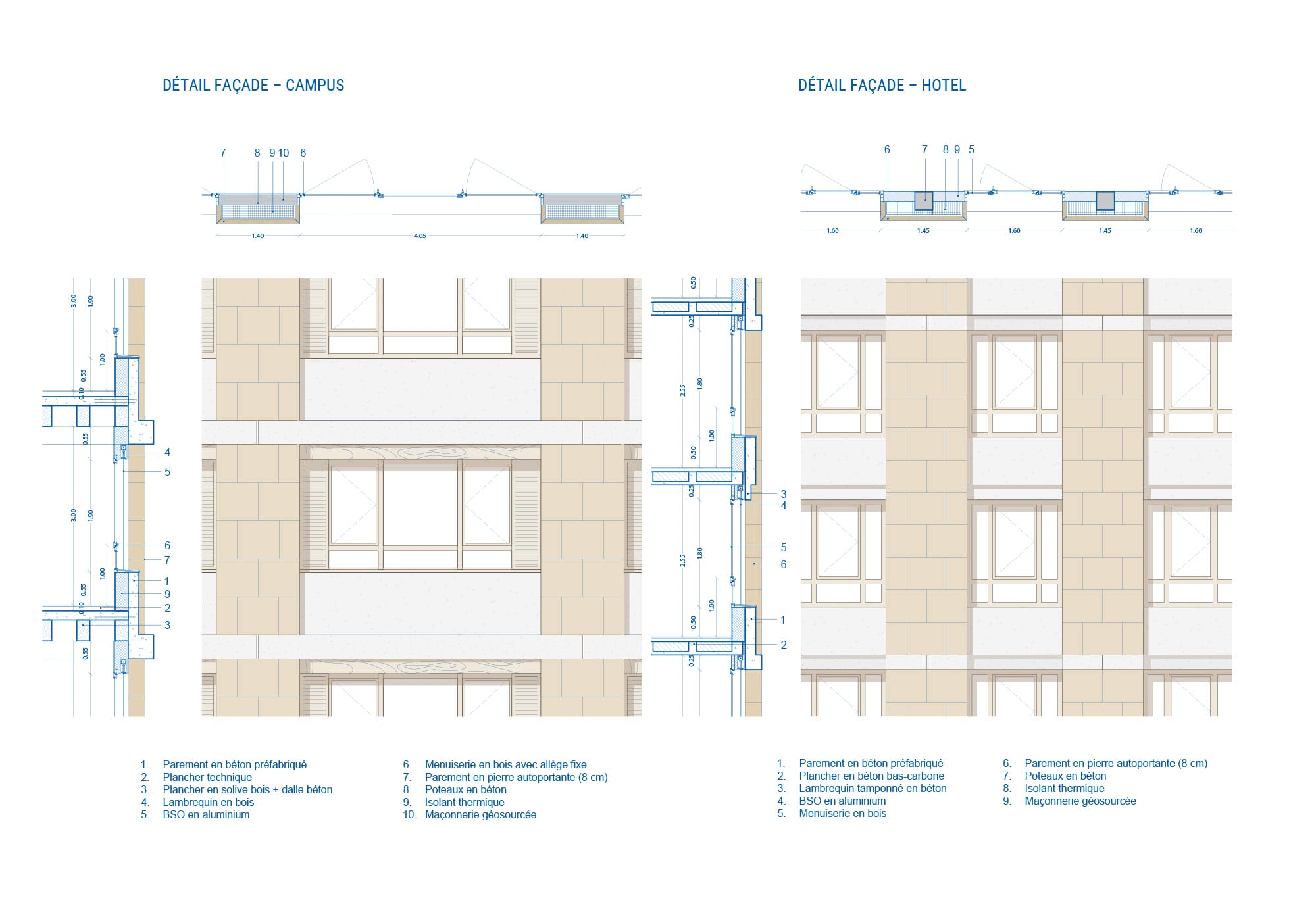 Les façades combinent avec finesse la pierre, le bois et le béton préfabriqué, pour une écriture sobre, pérenne et qualitative.
