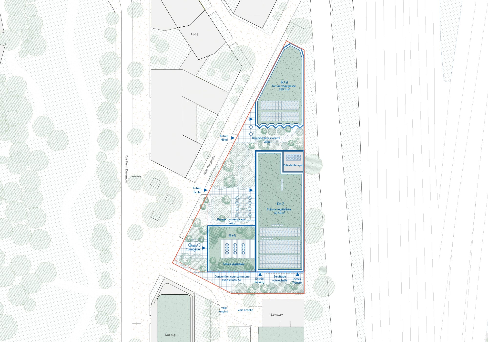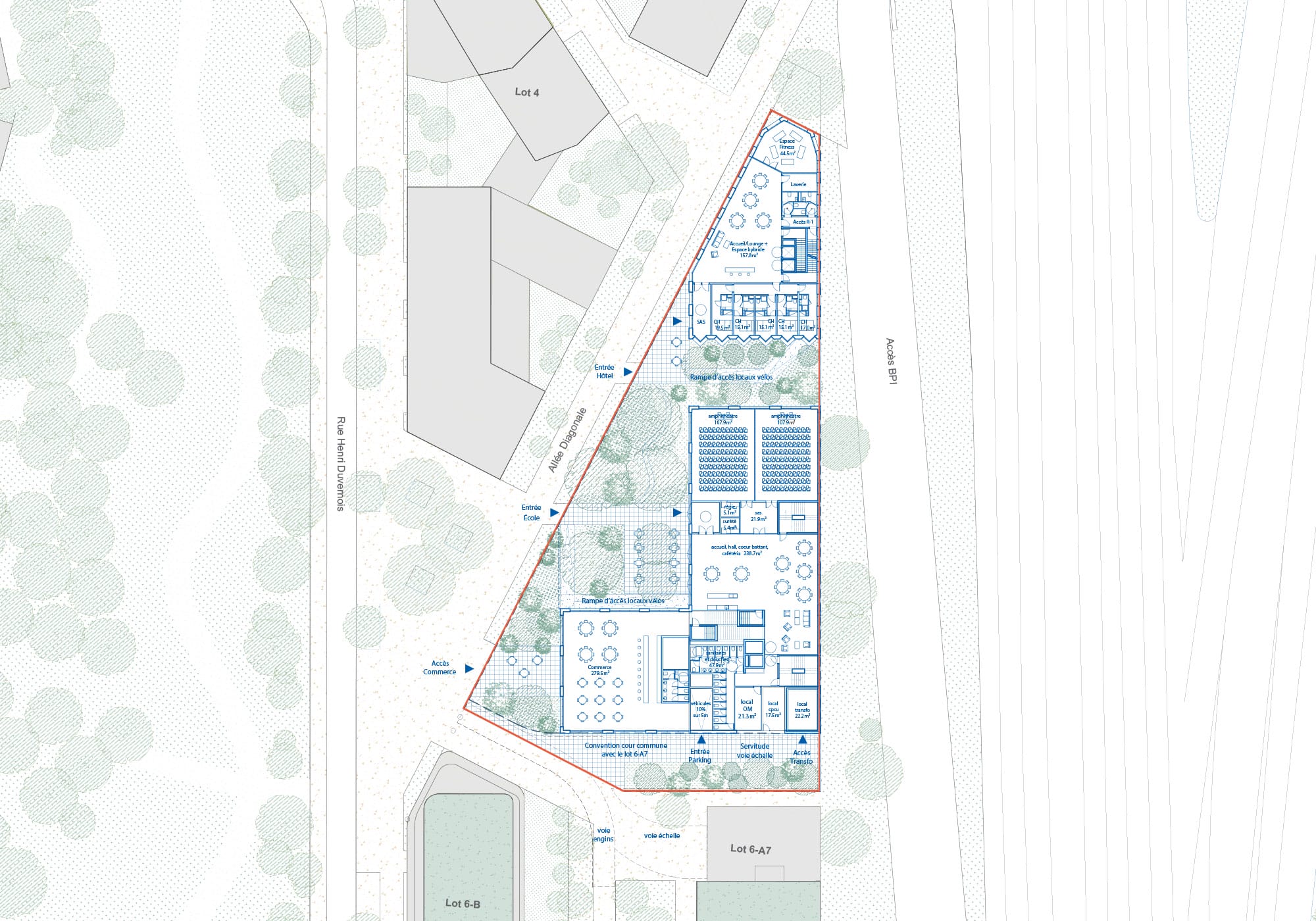 L’école s’implante au sud du lot 5, tournée vers le parc Aretha Franklin. Le bâtiment s’élève en R+7, avec un volume en retrait au Sud-Ouest limité à R+5, libérant ainsi une grande terrasse collective.