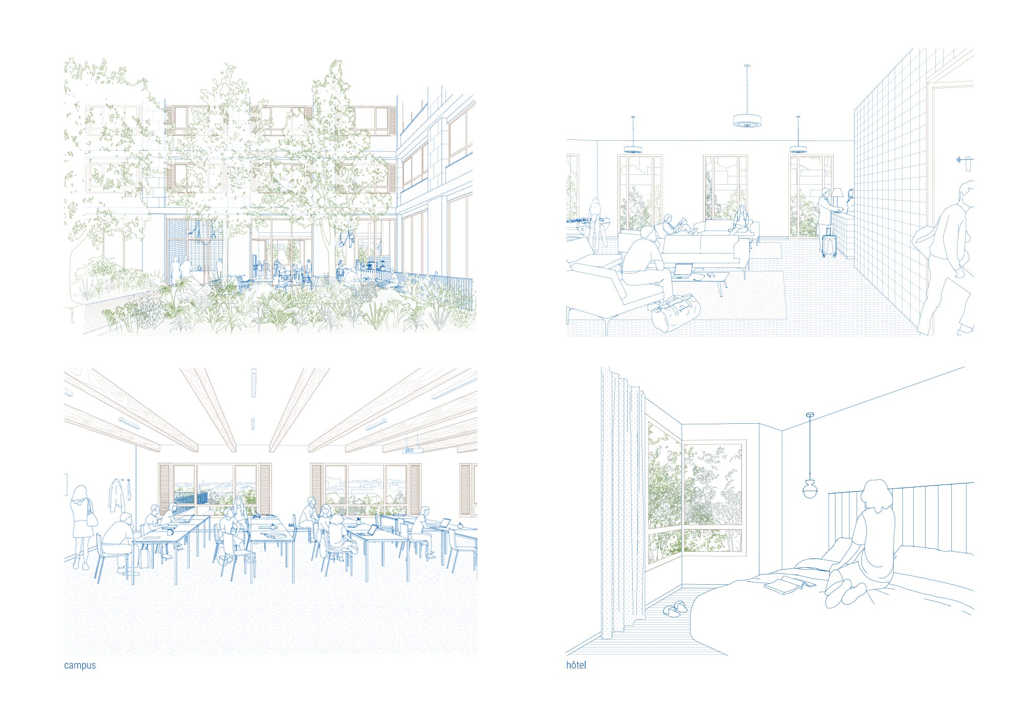 Les chambres et espaces extérieurs se développent principalement sur les façades Ouest et Sud, tournées vers la nouvelle urbanité, afin de bénéficier du calme de la Diagonale et d’éviter toute ouverture directe sur le périphérique.