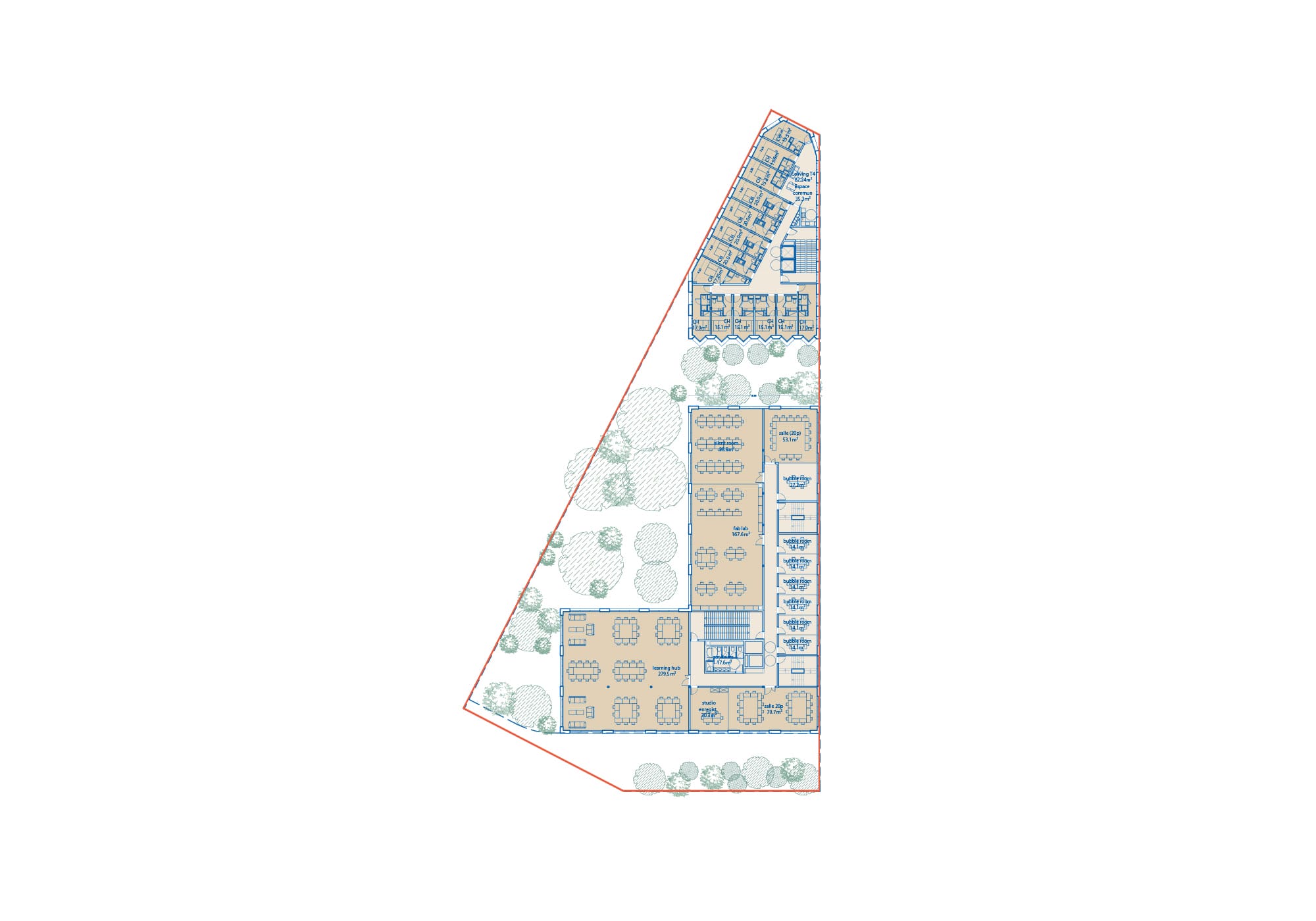 Le rez-de-chaussée concentre les programmes tournés vers le quartier et le grand public : auditoriums, restaurant, Fab Lab, ainsi qu’un commerce indépendant en façade sur la place publique et le parc, profitant de la visibilité et de l’animation de ce carrefour stratégique.