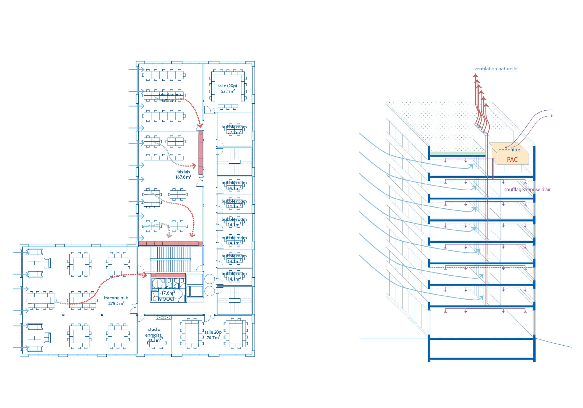 Le projet intègre le rafraîchissement naturel à toutes les échelles, notamment grâce à des cheminées de ventilation naturelle dans les grandes salles de l’école.