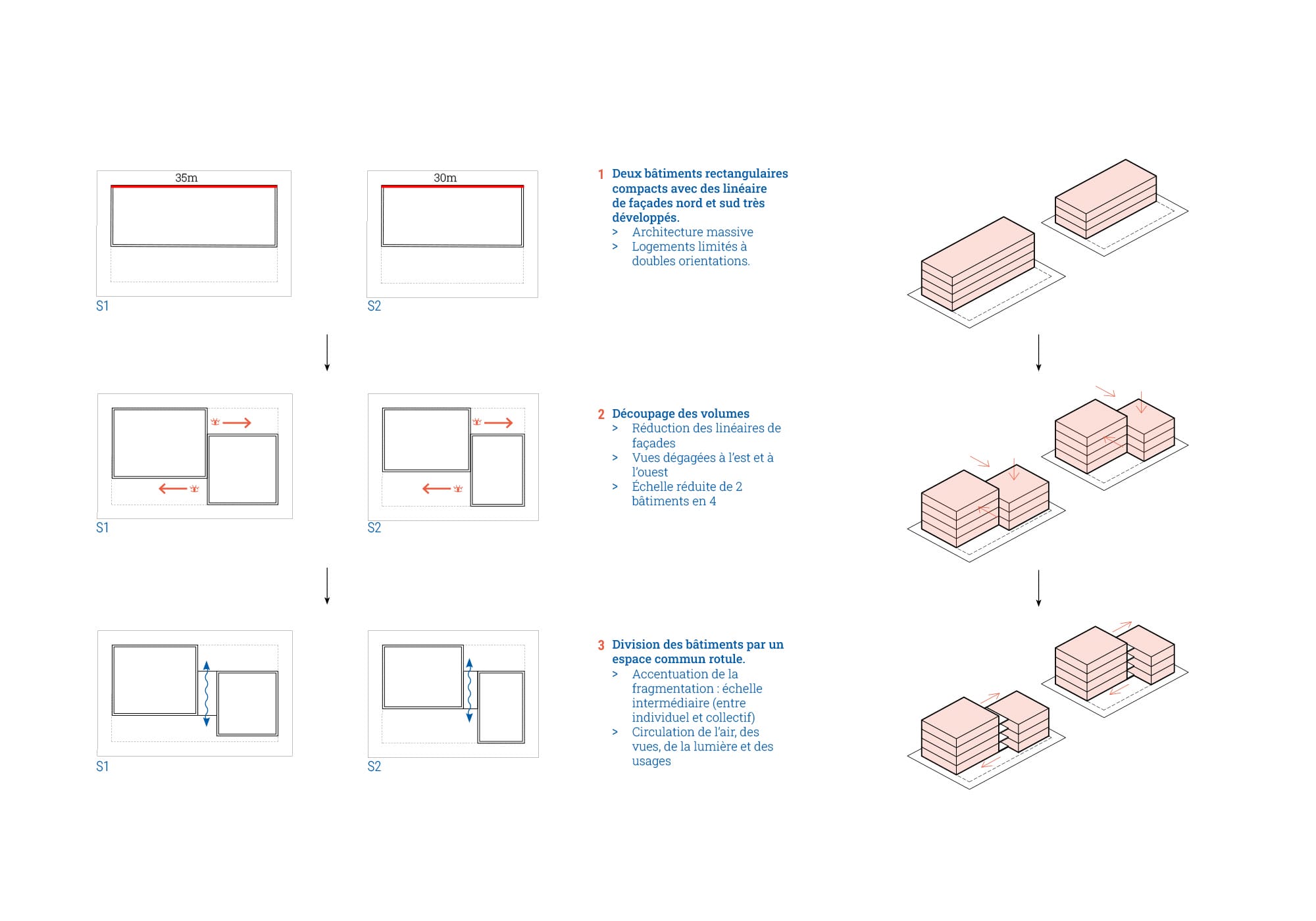 Le projet repose sur une échelle intermédiaire entre habitat individuel et collectif : volumes découpés, hauteurs limitées en R+2 et R+3, double orientation généralisée des logements et insertion d’espaces communs extérieurs jouant un rôle de transition semi-publique. L’écriture se veut sobre, rationnelle et pérenne, avec une composition claire, une palette de matériaux maîtrisée et des façades animées par les balcons et circulations. L’ensemble vise un haut niveau de confort d’usage, de qualité environnementale et une intégration pertinente dans le paysage urbain et naturel de la ZAC.