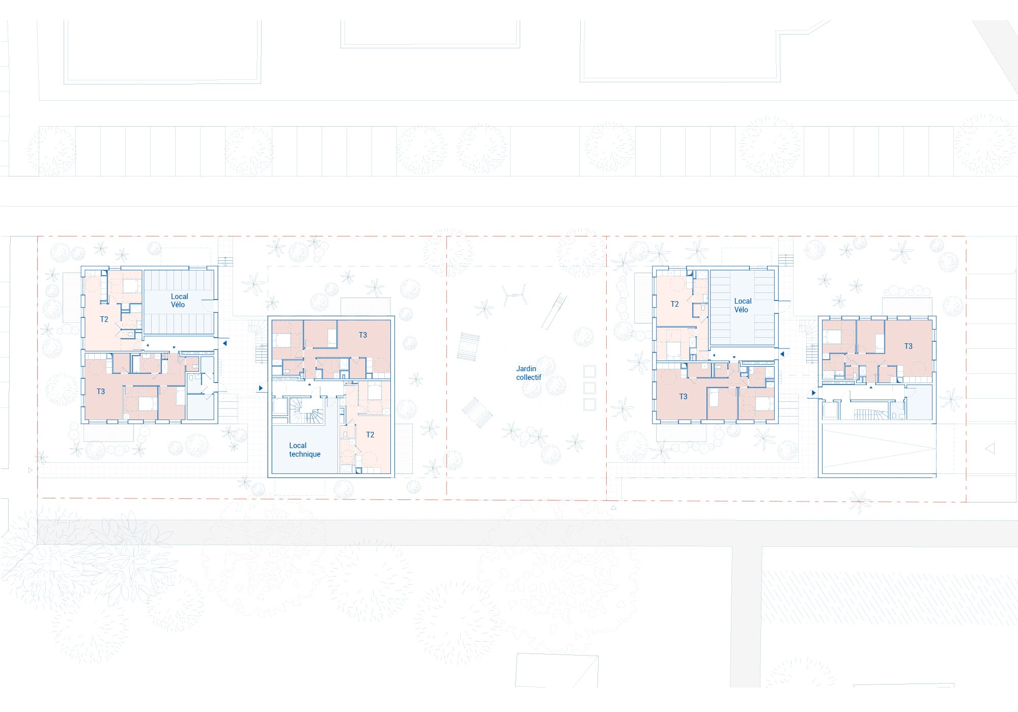 Il s’inscrit dans une logique de mixité sociale et typologique, associant logements en BRS, accession coopérative et locatif social PLS. Implantés en retrait de l’espace public, les bâtiments participent à la continuité paysagère, valorisent les vues offertes par la topographie et complètent le maillage d’espaces verts par des jardins en rez-de-chaussée.