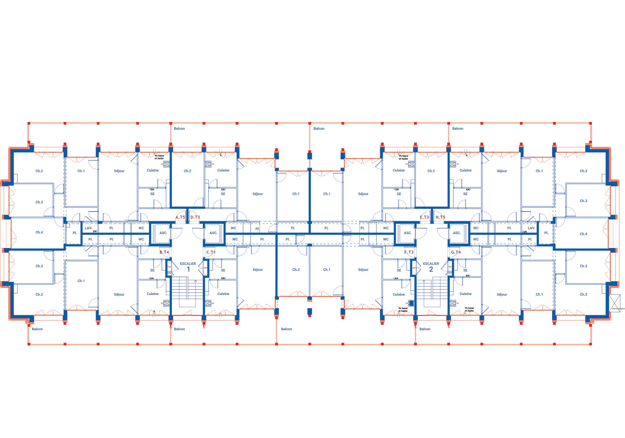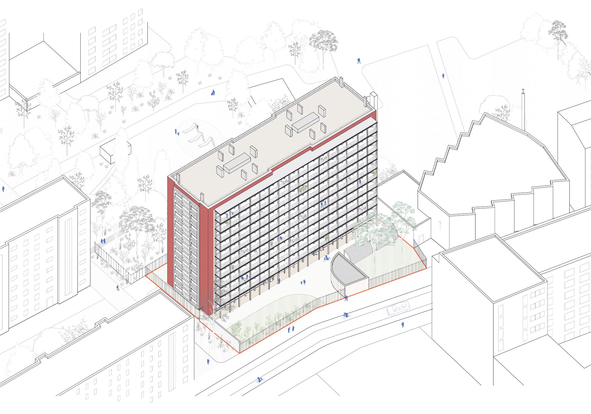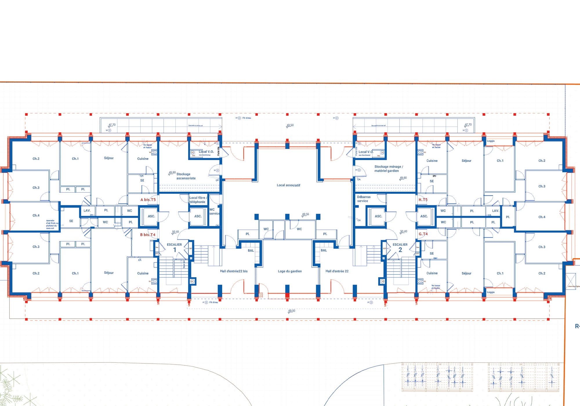 Les halls et espaces communs sont repensés comme de véritables lieux de transition, plus lisibles, lumineux et accueillants, contribuant à la valorisation des parcours quotidiens des habitants. L’ensemble de l’intervention cherche ainsi à concilier sobriété constructive, amélioration du cadre de vie et requalification durable d’un patrimoine existant, en inscrivant le bâtiment dans une nouvelle dynamique urbaine et sociale.