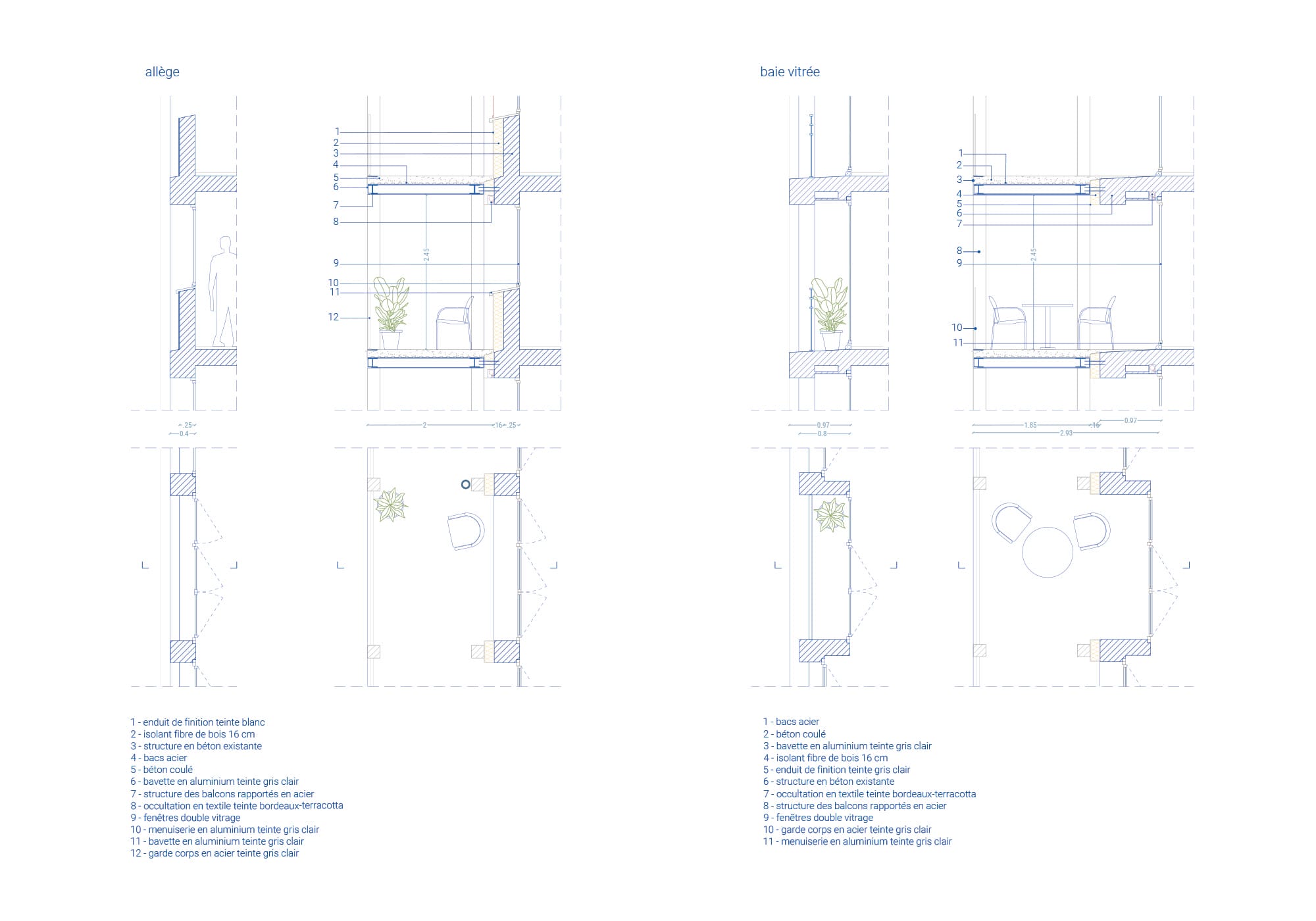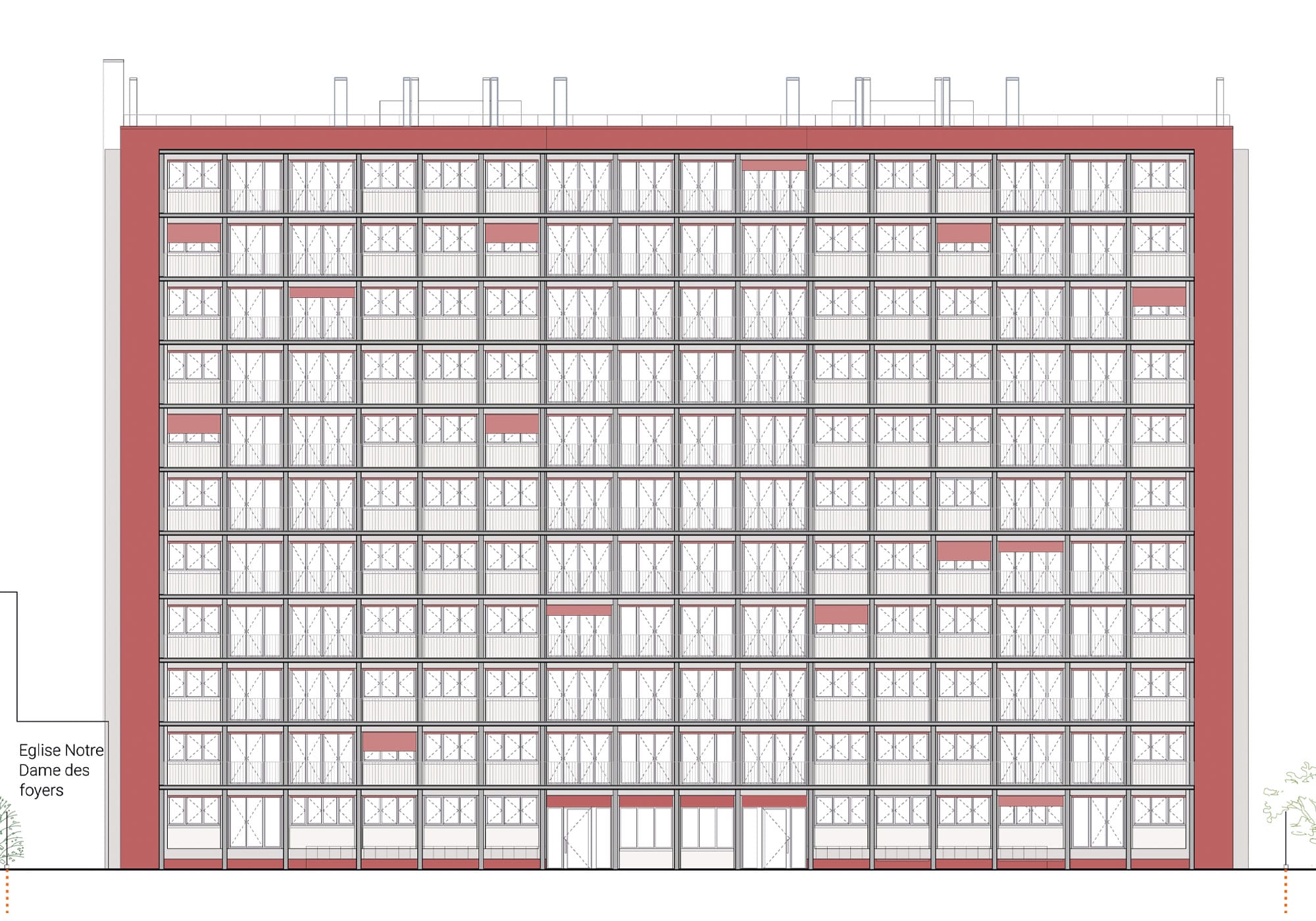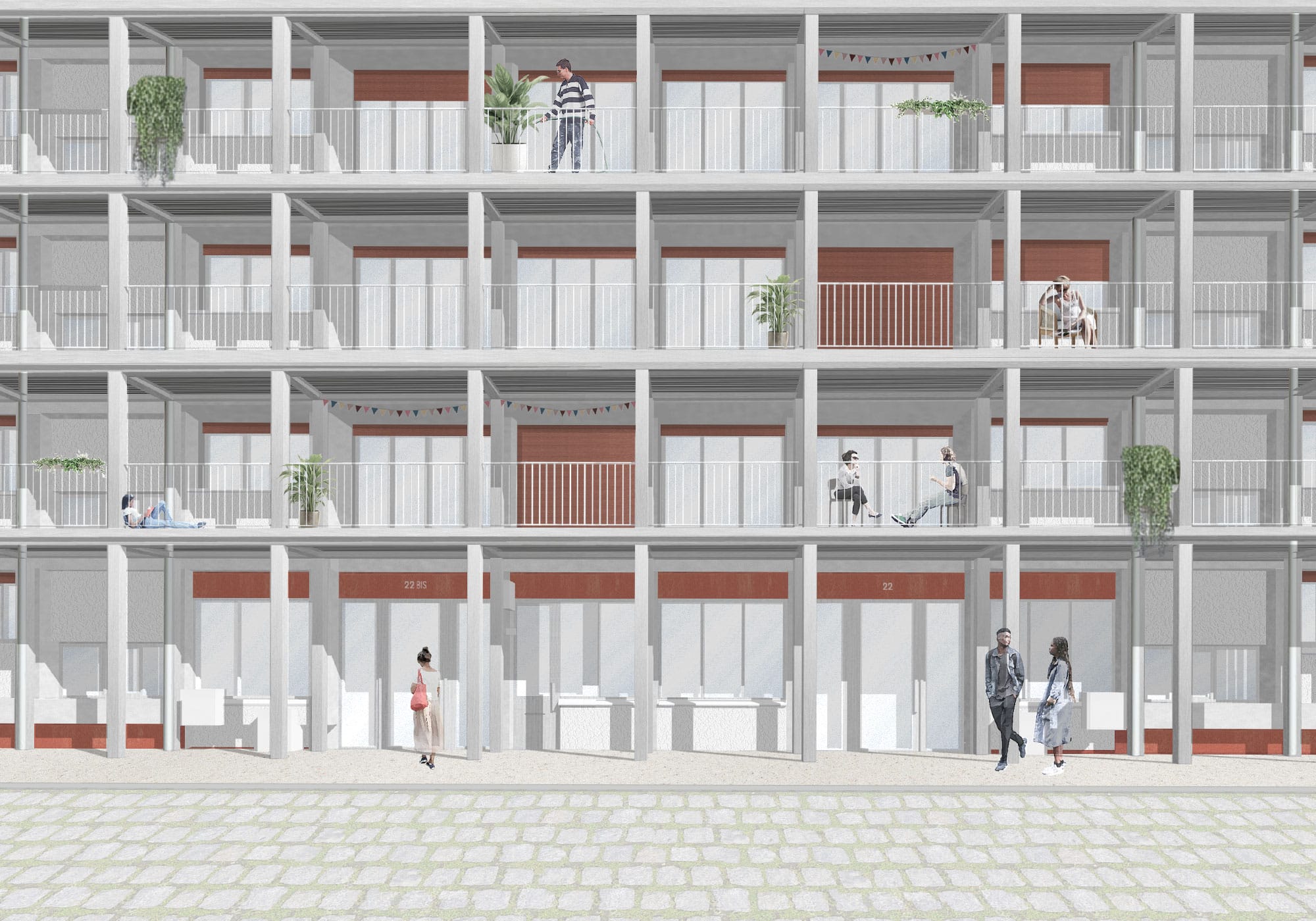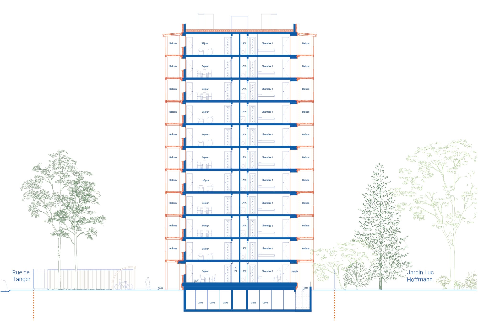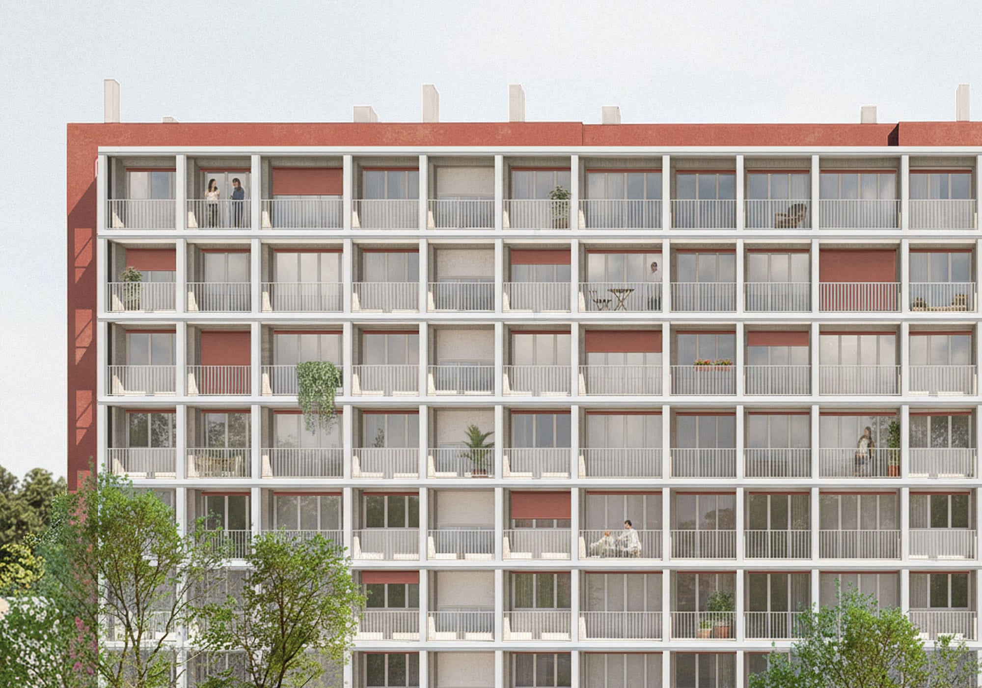 Une structure rapportée sur les façades est et ouest permet la création de balcons filants devant chaque pièce de logement, améliorant à la fois le confort d’usage, l’apport de lumière naturelle et le rapport au jardin et à la ville.